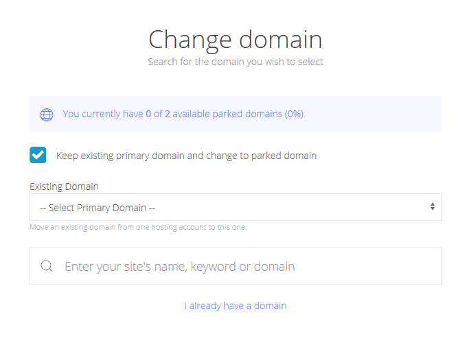 On the next screen select your domain from the Existing Domain list or type your domain name into the search bar to complete the change.